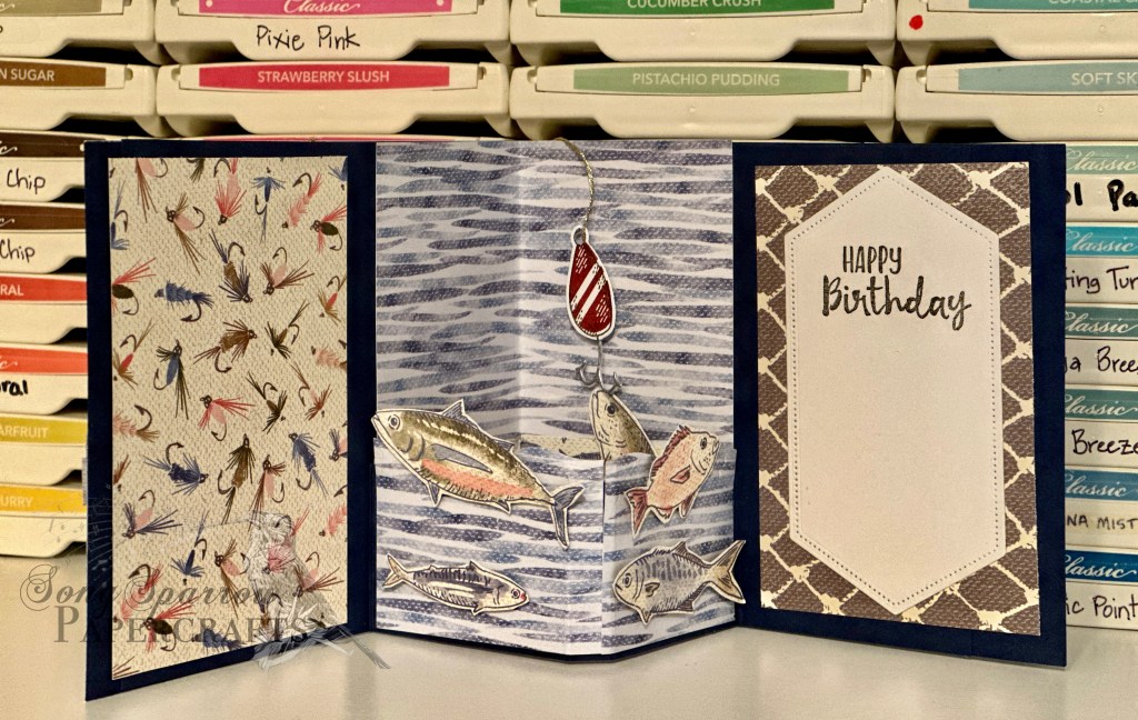 I’m excited to bring you another design using the Gone Fishing Suite. I also decided to tackle a new folding technique that Stampin’ with Kim shared this week, and I would highly recommend that you give it a try.
