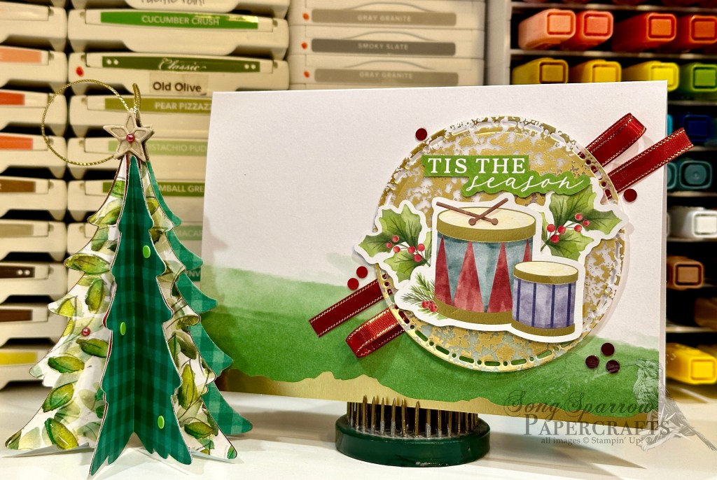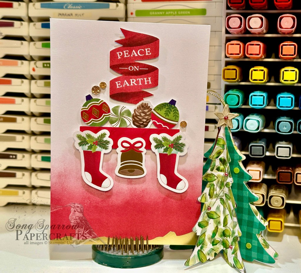 I love creating designs that seem to be peering through the trees. I’ve made several cards over the last couple of months that use this design concept. Today, we’re peering through the evergreens to this lovely Christmas tree in the center.