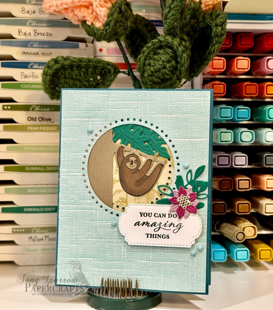 Today’s card design features the NEW Leaf Collection background stamp. We get started with a base of Shaded Spruce cardstock. Using the largest Perennial Postage die, I cut the white glimmer mat that sits behind the Leaf Collection panel. I stamped tone-on-tone with a super saturated layer of ink. The toucan is from the Sale-a-Bration Jungle Pals stamp set, along with the lovely hibiscus flowers which were diecut using the coordinating Jungle Pals dies. The flower centers are Berry Burst iridescent discs. The shimmery leaves are diecut from Old Olive glimmer paper using the Thoughtful Expressions dies. The sentiment panel is diecut from white cardstock using the Thoughtful Expressions dies and then I stamped the sentiment from the Perennial Postage stamp set. I added a strip of the Granny Apple Green ribbon duo trim behind the sentiment panel and a few iridescent discs on opposing corners of the sentiment panel. I really liked the contrast of the yellow-green elements against the darker green background.