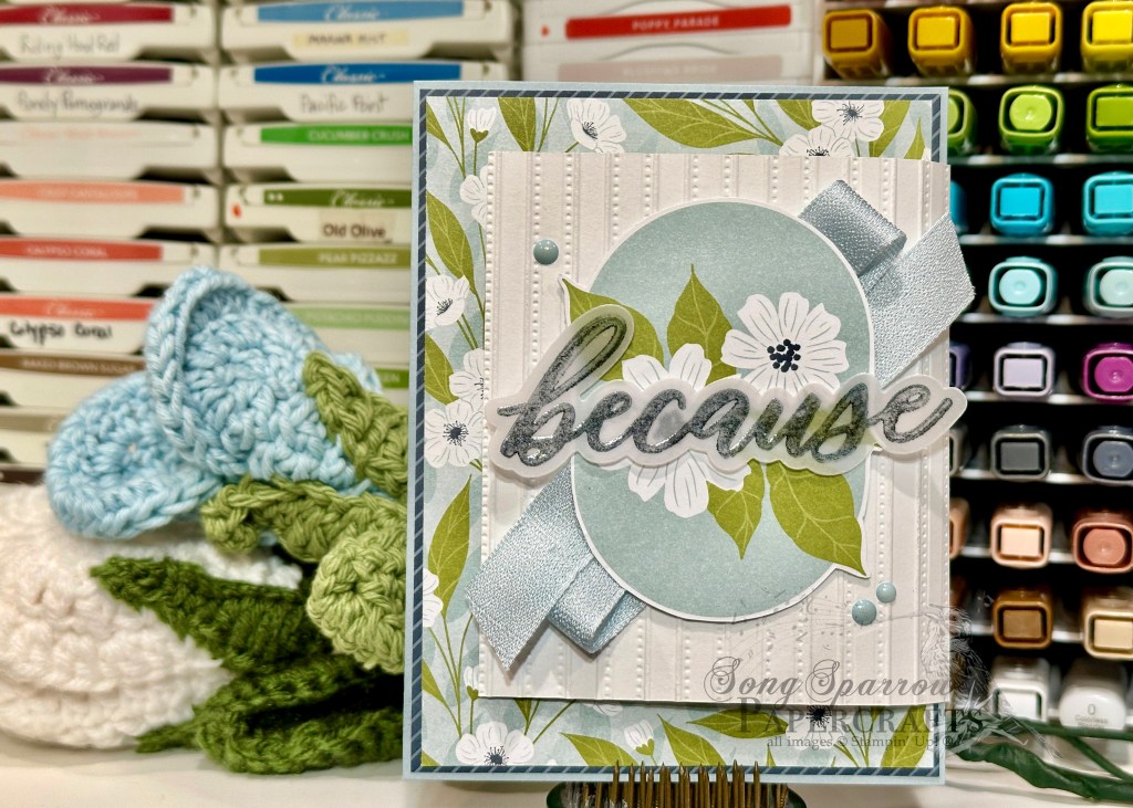 Our card front starts with a base of Cloud Cover cardstock. For this fun fold, we’re using a standard A2-sized base. The backdrop for our front focal panel is a combination of two patterned papers. The mat is from the Traditions of Christmas pack and our floral panel is from the new Lovely Blossoms pack. Our focal panel base is white cardstock that is embossed with the new Lovely Stripes embossing folder. This folder gives a nice, deep impression in the paper making the details really pop. I used my paper snips to cut closely around the focal image from the ready-made panel I cut from the Lovely Blossoms paper. The little detail of the overhanging leaves just added a nice soft touch to the card front. The because sentiment is from the Words of Beauty set and is stamped on vellum with Secret Sea ink and then set with clear embossing powder before being diecut with the coordinating outline die. It’s adhered to the focal panel with glue dots to keep the adhesive invisible. The focal panel is adhered to our embossed panel with dimensionals over a twist of the new Cloud Burst ribbon and we finish off our focal panel with a dash of subtle twinkle with the new Moody Palette glossy dots.
