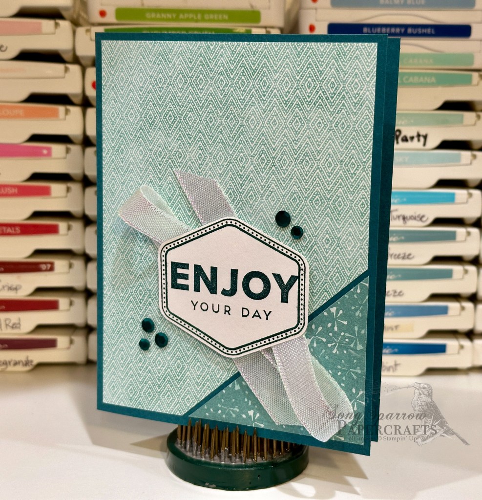 This week, we’re exploring designs using the Saying Hey stamp set by Stampin’ Up! This photopolymer stamp set coordinates with the Heartfelt Hexagon punch and contains sentiments that cover all of your major occasions. Today, we’re pairing up our stamp set with a number of different patterned papers from several designer series paper packs.