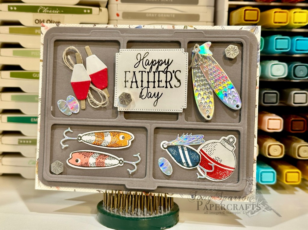 There are so many things that you can do with the combination of stamps and dies. And today’s card shows the most straight forward way — filling a tackle box. I don’t know about you, but I grew up fishing with my family. And it was always a treat when we could choose something to use from dad’s tackle box!