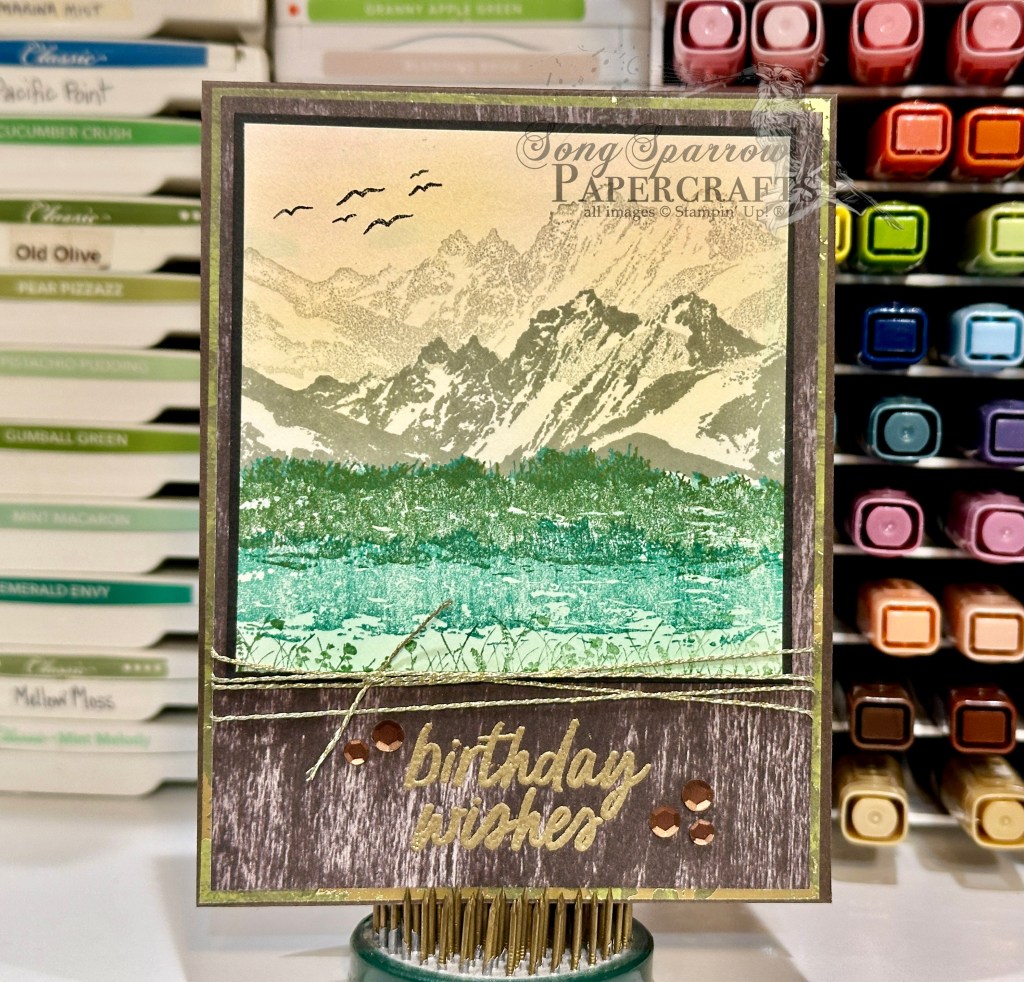 We get started with a base of Early Espresso cardstock. The background panel of the darker woodgrain sheet from the Country Woods paper pack is matted with a sheet of the Old Olive Season of Elegance paper. The sentiment from Simply Said is heat embossed in gold centered underneath the focal panel. The mountain scene is stamped on Very Vanilla cardstock using a combination of gray and green shades. The mountain stamp is from In the Grove, while the grasses are a combination of In the Grove and Grassy Grove stamps. I filled in the shading of the sky and grass with a combination of blending brushes but chose to simply use them as they sat in my storage bin for an even subtler shading effect. I used the birds from the all-too-fun Friendly Seagulls stamp set to add realism to the sky above the mountain range. The scenic panel is mounted on Basic Black cardstock and then affixed to the background panel. I wrapped some gold thread around the panel before affixing it to the card base. A few copper sequins from the neutrals set add a touch of sparkle to draw the eye to the sentiment.