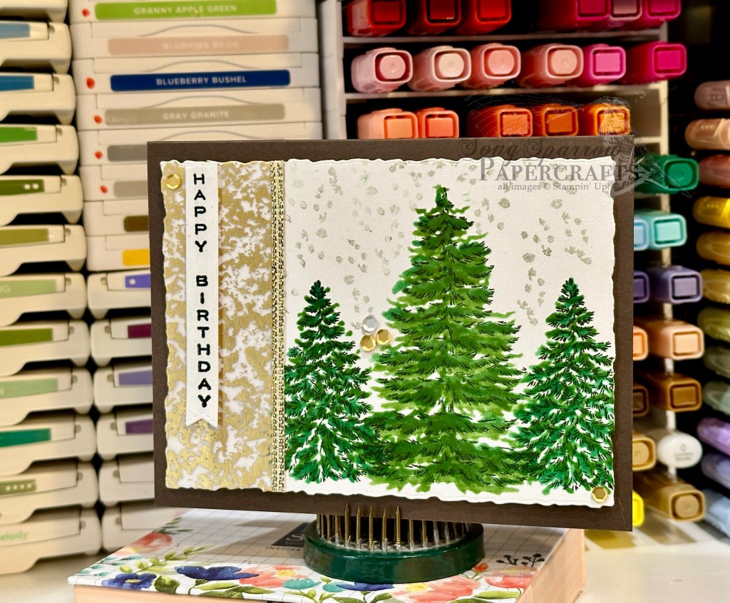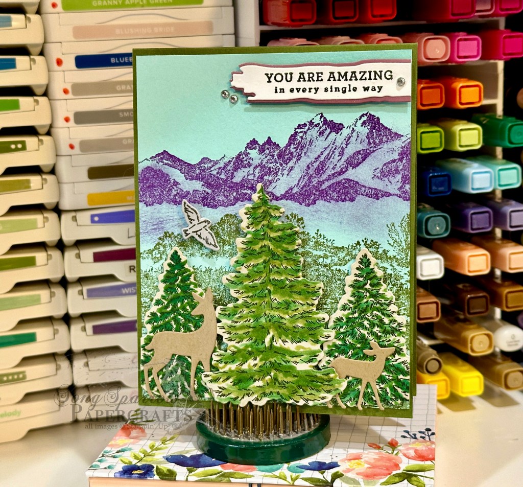 This lovely gets started with a base of Blackberry Bliss cardstock. The focal panel backdrop starts with a quarter panel of white cardstock that is machine embossed with the Dotted Circles embossing folder and is then matted with the Thoughtful Designs specialty paper. Our Thankful Garden bundle takes center stage here with the hydrangea bloom in the center. After stamping the image on white cardstock several times, I used the decorative masks to color the image. I chose to have the blooms be a combination of pink and purple — which was my grandmother’s favorite hues to aim for with her hydrangea (easier said than done). A layer of Wink of Stella over the blooms makes them shimmer in the light. The coordinating dies made quick work of cutting out the bloom and adding the life-like dimension. A combination of pink and purple regal dots serve as the floret centers. I cut some extra stems of leaves from a combination of the Lovely Garden patterned paper and a sheet of Shaded Spruce and laid the hydrangea bunch on top. The sentiment is created using a combination of Sweet Blooms dies and She’s the Greatest stamps. The lovely is cut from purple silver foil and Berry Burst glimmer paper. I adhered the two layers together with the glue pen before adhering over a bow of iridescent striped ribbon. I stamped Mom in Blackberry Bliss on white cardstock and used a heart punch to cut it out. It’s adhered with a dimensional. A few drusy embellishments finish things off with an extra sparkle.