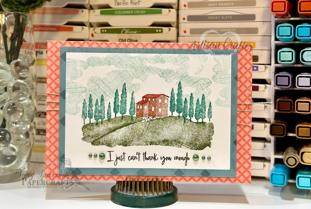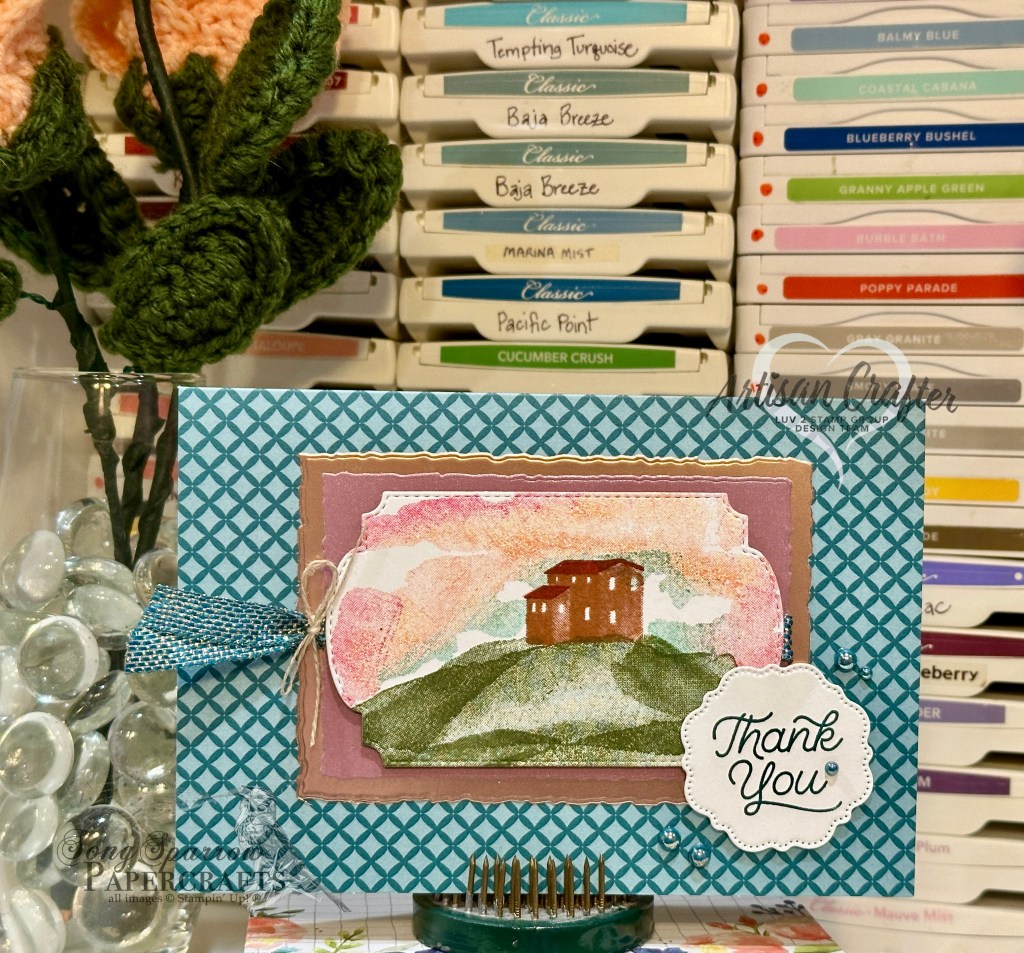 Our super simple card design begins with a base of Calypso Coral cardstock. Our focal panel is a beautiful 4×6 notecard from the Mixed Media Florals Memories & More pack. I cut the notecard down to fit the standard-sized card front and then added some Earth Tones shimmer gems. Voila! That is IT and what a stunning result, in my humble opinion anyway.