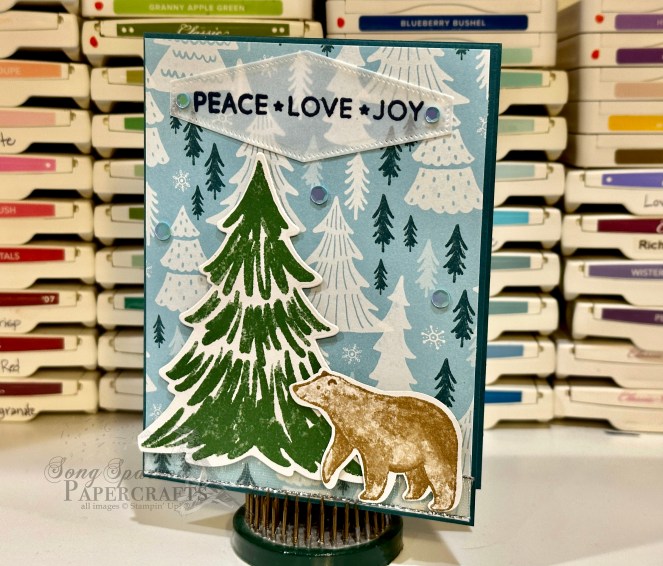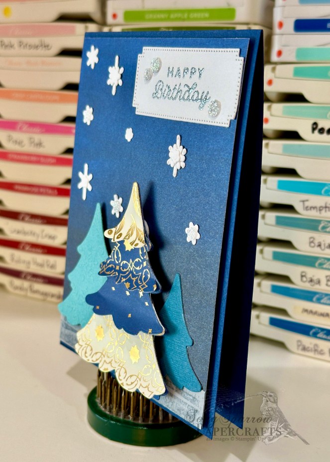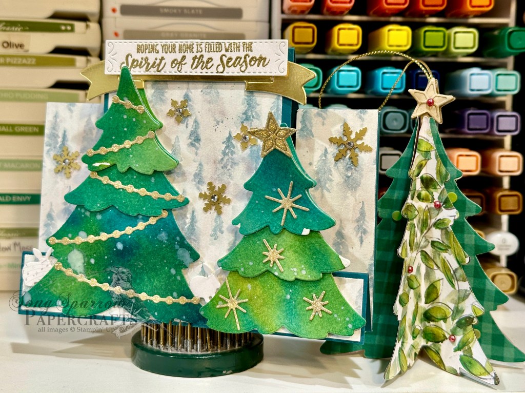 We get started with a base of Pretty Peacock cardstock. A sheet of the Winter Meadow designer series paper serves as our backdrop for the center focal panel. Our pair of trees start with a custom coloring technique using Pretty Peacock and Old Olive ink. (Tune in on my YouTube channel on Tuesday for a full tutorial during the next episode of Terrific Tuesdays!) I also splatter some white craft ink to give the look of snowflakes falling in front of the branches. Using all of the various sizes of trees in the Merriest Trees die set, I cut out tree panels and then selected ones to layer to create each tree. Dimensionals on the bottom fringes of the branches help give a little dimension and the look of the stacked branches. Each tree is then decorated with garland and stars cut from textured gold specialty paper. The trees are adhered to the bottom of the center fold portion of the card base with dimensionals. Our sentiment consists of a mat of gold foil cut with the banner die from the Peaceful Season die set. The sentiment from Merriest Trees is heat embossed in gold on white cardstock and then diecut using the Peaceful Season dies. It’s adhered to the top of the center panel with dimensionals. I tucked a few bunnies by the trees for a little added interest and then scattered snowflakes in the background.