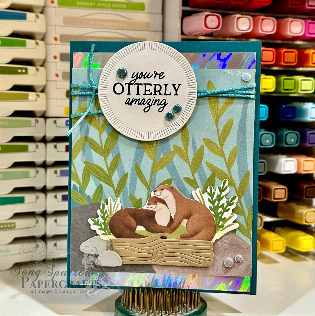 Our card is built on a base of Pretty Peacock cardstock. I selected a sheet of the fish pattern from the Otterly Adorable paper pack to serve as backdrop for the card front and our hidden sentiment. A slit in this piece of patterned paper allows for the movement of the front focal panel and the reveal of our hidden sentiment. I used pieces of the Pretty Peacock cardstock for the movement pieces. The focal panel is a combination of a cute otter scene from another sheet of the Otterly Adorable paper and a mat of Pretty Peacock glimmer paper. A piece of the Pretty Peacock & gold metallic ribbon serves as the pull. The focal panel is affixed to the slide to complete the sliding panel. I broke up the sentiment stamp from the Sweet Blooms set so that each word is on a separate line so that the sentiment hides perfectly behind the front sliding panel for its big reveal. The card front is finished off with riverside pearls, shimmer gems, and heart sequins for some eye-catching twinkle. I used a Mixed Labels sentiment for the inside message and finished with piece of the fish patterned paper to tie everything together.