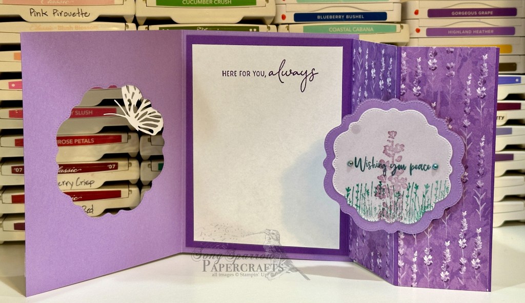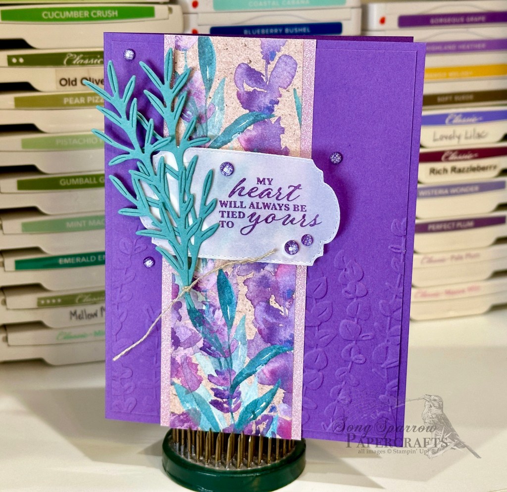 With the release of new products to the Last Chance products list, it seemed like a fitting time to revisit some of my favorite products that will be leaving us for good. And today’s card combines quite a few of my faves in one design — Painted Lavender, Distressed Tiles embossing folder, and the Wanted to Say sentiment die set.