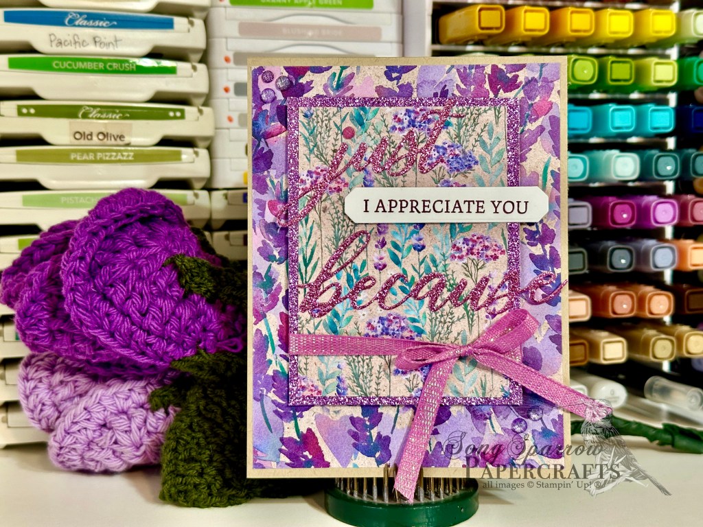 For the remainder of this week, I thought it would be appropriate to tiptoe back through the garden florals since it’s in the 80s here in North Texas. And today we’re pairing up the ever-lovely Perennial Lavender patterned paper with the Words of Beauty stamp and die bundle.