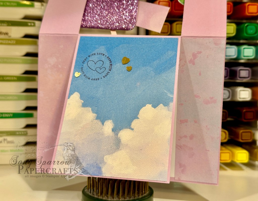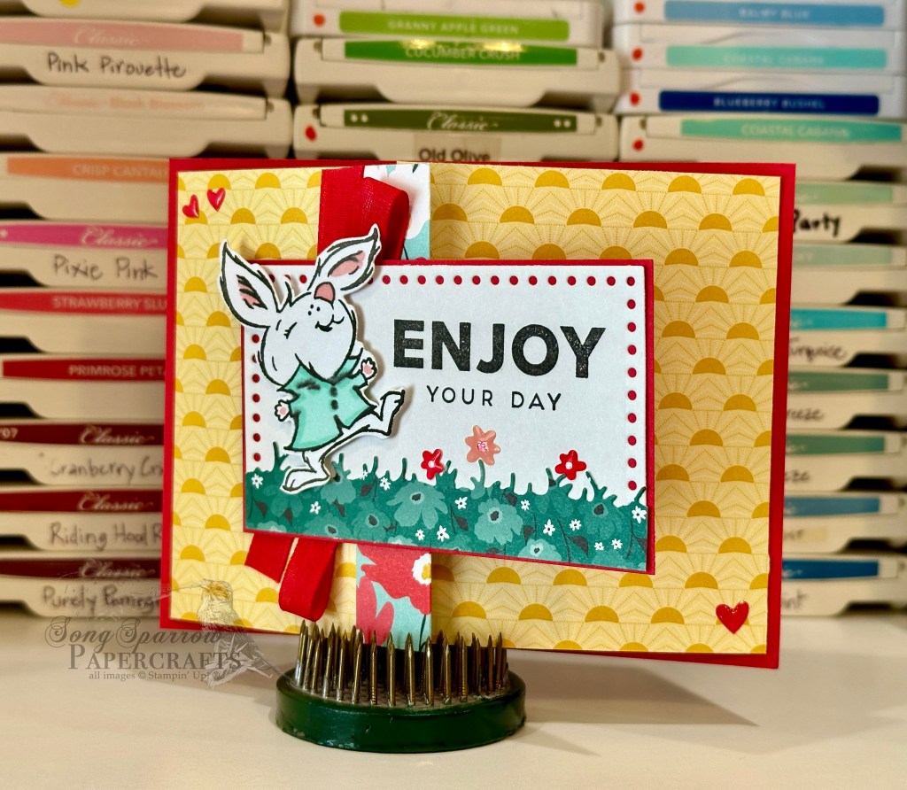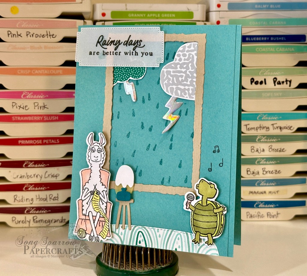 This design is a combination of some of my favorite patterned paper — Everyday Skies — with two of my favorite pick-me-up stamp bundles — Playing in the Rain and Bright Skies. Both of these stamp bundles are on the current Last Chance list, so if you love them as much as I do, now is the time to swipe them for your stash! For today’s design, we’re keeping it pretty simple because these three products work super well together.