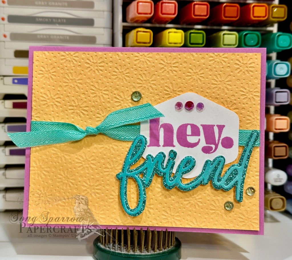 Our card design gets started with a base of Petunia Pop cardstock. Our background panel of Peach Pie is machine embossed with the SAB Starstruck embossing folder and oriented so that the negative side is facing up. I tied a strip of Summer Splash trim around the center of the embossed panel before adhering it to the base with dimensionals. The sentiment from Saying Hey is stamped in Petunia Pop ink before getting punch with the Heartfelt Hexagon punch and then adhered over the ribbon with dimensionals. I cut the word FRIEND from two different glimmer papers. The outline is from Summer Splash glimmer paper while the word FRIEND itself is from the pastel ombre glimmer paper. An extra layer of dimensionals helps FRIEND to stand out. A few purple sequins and some Sunny Days transparent dots bring the eye squarely to the party in the middle.