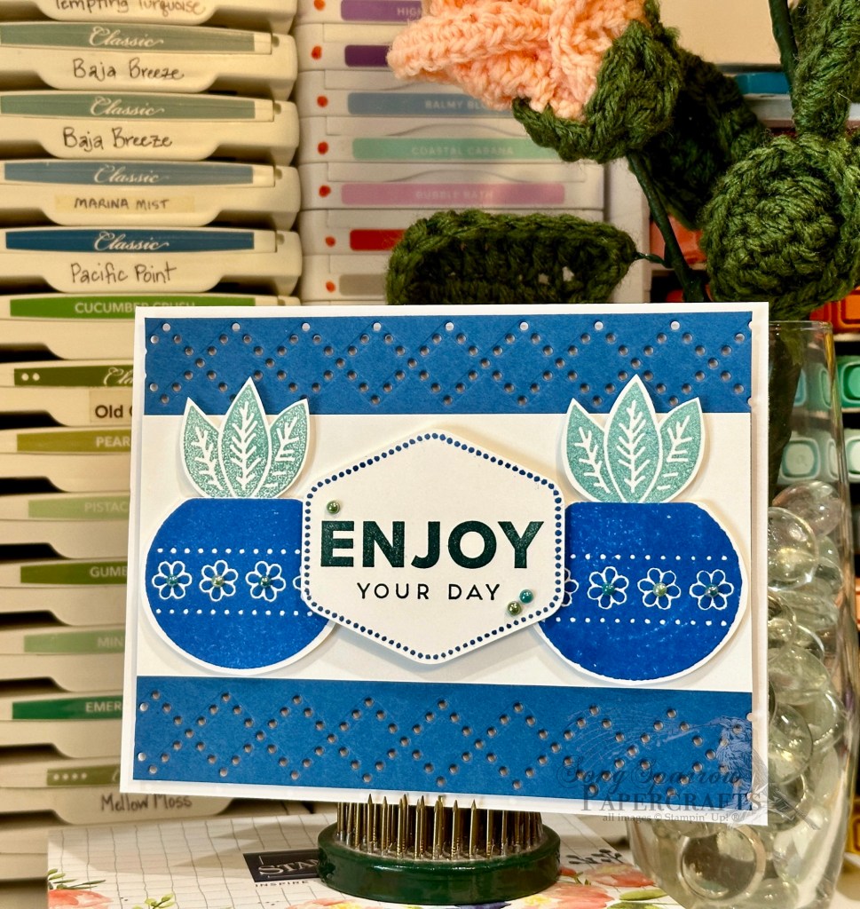 We get started with a base of Boho Blue cardstock. The background panel is a sheet of the Timeless Plaid in blue. I used the reverse side of the Pool Party plaid sheet from the same pack as the center background elements and punched the shapes using the To the Point Label punch. Although it’s difficult to see in the photo, there are very faint lines of Pool Party in the blue plaid sheet, making the Pool Party plaid sheet the perfect compliment to really draw out those subtle stripes. The sentiment panel is stamped on white using the Hugs for Life outline stamp and the sentiment from the Heart Shaped stamp set. The panel is punched with the To the Point Label punch. I tied some Night of Navy linen thread around the background panel and passed it underneath the sentiment panel. I added some rhinestone basic jewels and industrial trinkets to finish things off.