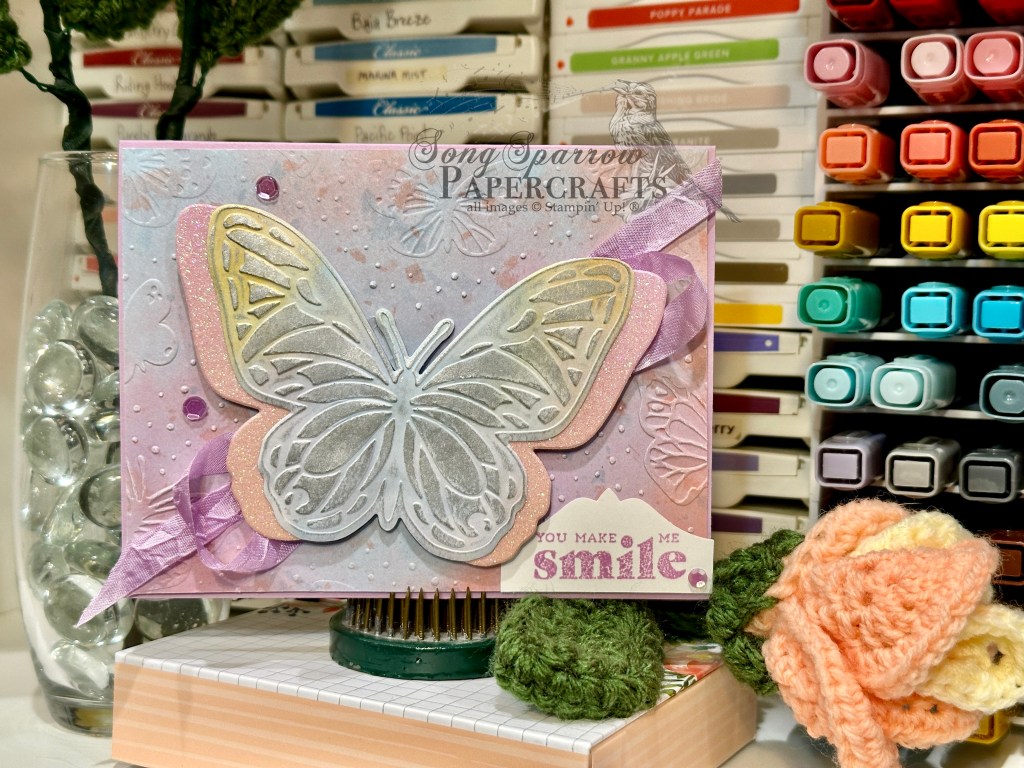We’re continuing our patterns & sentiments design series as we tiptoe through the toadstools today. It’s been a long while since I’ve made an angled gatefold card, and I saw the cutest card using the Sale-a-Bration Toadstool Gardens designer series paper. So I’m taking a stab at this fun fold using our patterns & sentiments design theme.