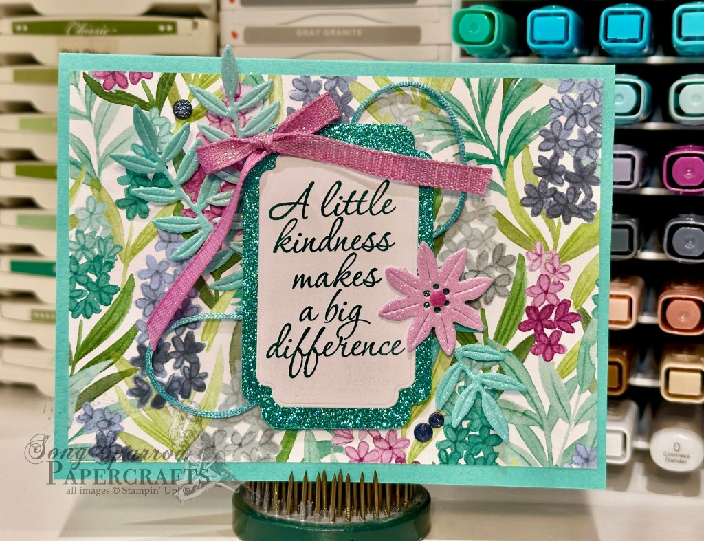 This card starts with a base of Summer Splash cardstock. A sheet of the Florals in Bloom paper serves as the backdrop for our focal panel. The sentiment from the new Label Me Grateful stamp set is stamped in Pretty Peacock on white cardstock and then diecut using the Something Fancy dies. To help the sentiment really pop against the floral background, we mat it with a panel of Summer Splash glimmer paper that’s cut with the next size die up in the Something Fancy set. We mount the sentiment panel with dimensionals over Lost Lagoon soft cording and some greenery cut from the pastel ombre glimmer paper using the Label Me Grateful detail dies. I added a diecut flower and Petunia Pop iridescent ribbon for some pops of color around the sentiment panel. We finish off with a few charming shimmer faceted dots on either side of the focal section.