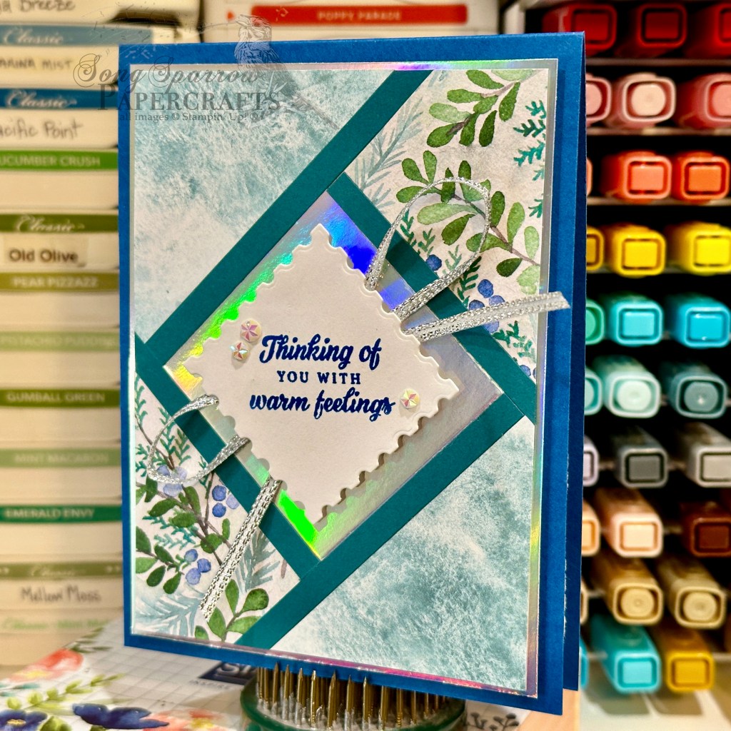 Our sentiment is in two parts. The top sentiment you’re amazing from Scenic Adventure is stamped in Versamark on Crumb Cake and then heat embossed with copper. I cut around this sentiment using paper snips. The sentiment panel is adhered to a sheet of pastel ombre glimmer paper and then cut to mat the sentiment. The full panel is adhered to the top of the sunset using dimensionals. We cut our bottom sentiment panel from Pretty Peacock glimmer paper using the Nested Essentials dies. The bottom DAD sentiment from He’s the Greatest is stamped directly in the center of the peacock panel in Versamark and then heat embossed with copper. This panel is mounted with dimensionals in the center of the card at the bottom of the front panel over some linen thread. We finish things off with some In Color flat pearls and riverside pearls.