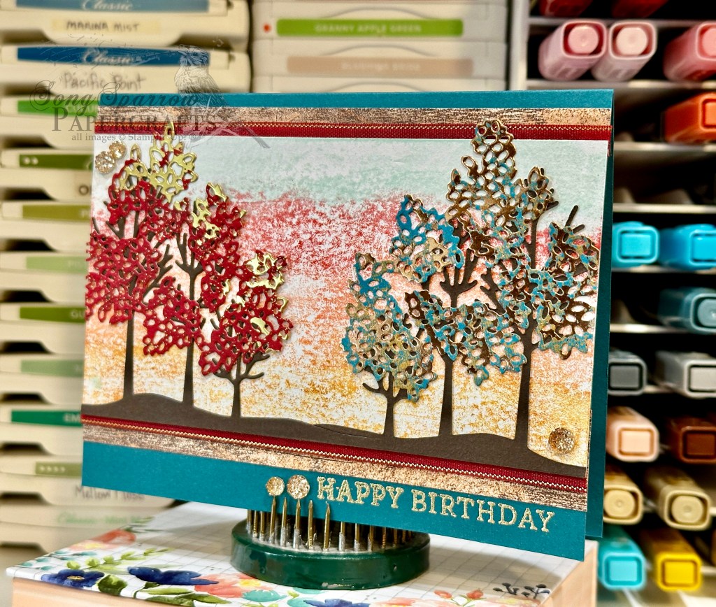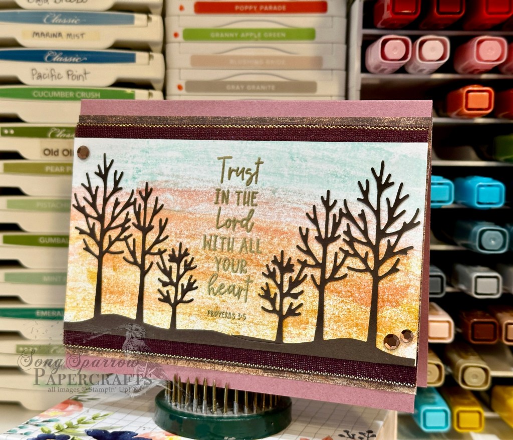 Our card gets started with a base of Crumb Cake cardstock and then I cut a window using the Textured Notes die. To create the sunset in the background, cover a clear block with a combination of Crushed Curry, Pumpkin Pie, and Flirty Flamingo ink and then spritz with water before stamping on the quarter panel of Very Vanilla cardstock. For some extra interest and a touch of mystical sparkle, add some Wink of Stella to the panel before adhering to the back of the front panel so that it peeks through the window. The trees and grass are cut from a combination of Mossy Meadow, Shaded Spruce, and Crumb Cake using the Scenic Adventure dies. The grass is adhered directly to the front panel, while the trees are adhered with dimensionals to give some depth to the scene.