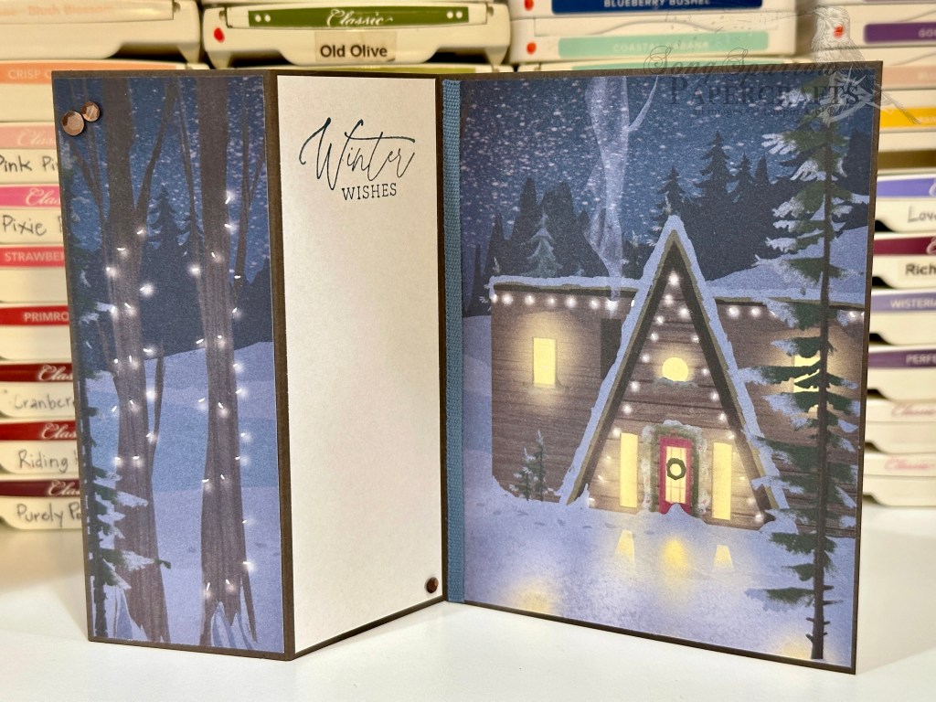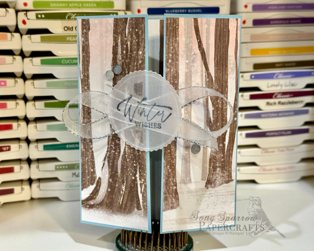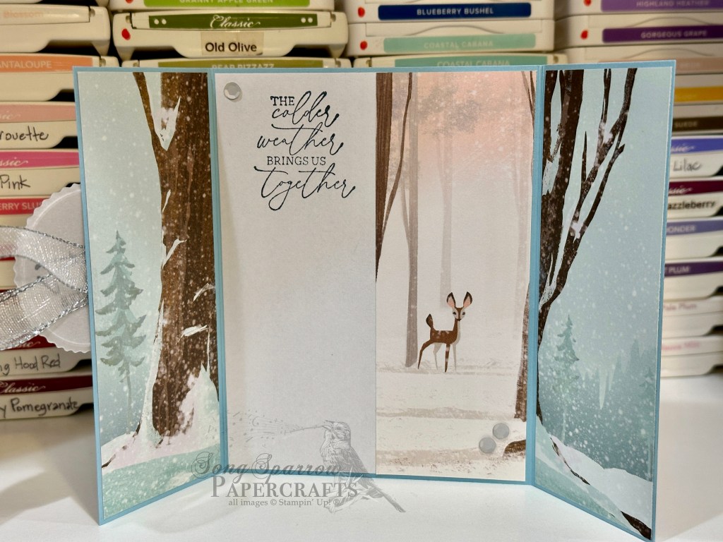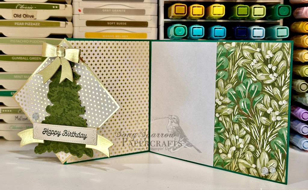 We get started on today’s fun fold design with a base of Shaded Spruce cardstock. We cut a standard-sized base but in landscape orientation with a fold in the center and then one to divide the second half. I chose two different patterns from the Season of Green & Gold designer series paper pack, a current Stampin’ Up! Online Exclusive. We’re bringing out the gold foiling by using the gold foil specialty paper as an accent color on our diamond panel. Our focal image is the largest tree from the new Peaceful Evergreens bundle. It’s stamped and diecut from Mossy Meadow with a gold bow diecut and added to the top. The new Peaceful Evergreens die set that will release on September 6th with the Holiday Mini catalog includes a set of dies to make paper bows and it really makes it easy to have perfect bows for your cards! Our sentiment from Adventurous Sky is stamped in black on Very Vanilla cardstock and then diecut using the Peaceful Season dies. This panel is mounted on a gold foil banner diecut with the largest banner from that same die set. I added some drusy embellishments for lots of extra sparkle and to help draw the eye across the card front.