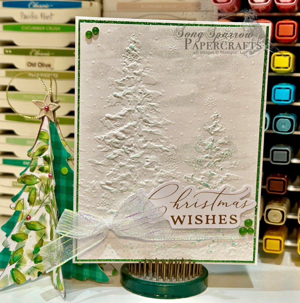 So we get started with a base of Shaded Spruce cardstock. The center section has been removed to insert the window sheet section. Each side of the front panel cardstock pieces are covered with the evergreen patterned sheet from the Elegant Pine Snowflakes paper pack. The snowflake is cut from another sheet and then adhered on the window section. The sentiment from the Delicate Pines stamp set is stamped in Versamark and then heat embossed with gold embossing powder on vellum. The panel is then cut with one of the smaller banner dies from the Stylish Shapes set using the extension method. It’s adhered with tear-n-tape over the snowflake.