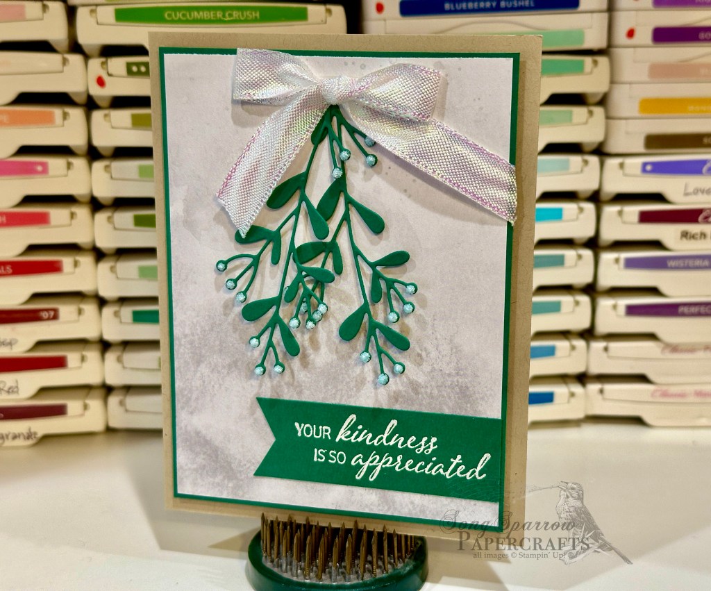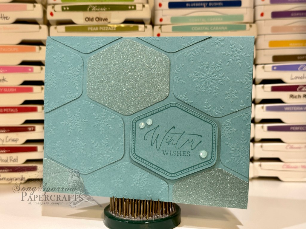 We’re taking a trek in the woods this week, and as much as I love all things autumn, I thought it would be nice to show how a few simple tweaks can yield beautiful winter designs. Today’s card is another clean and simple design, and we’re highlighting the Stampin’ Up! In the Grove dies and the Snowflake Sky embossing folder.