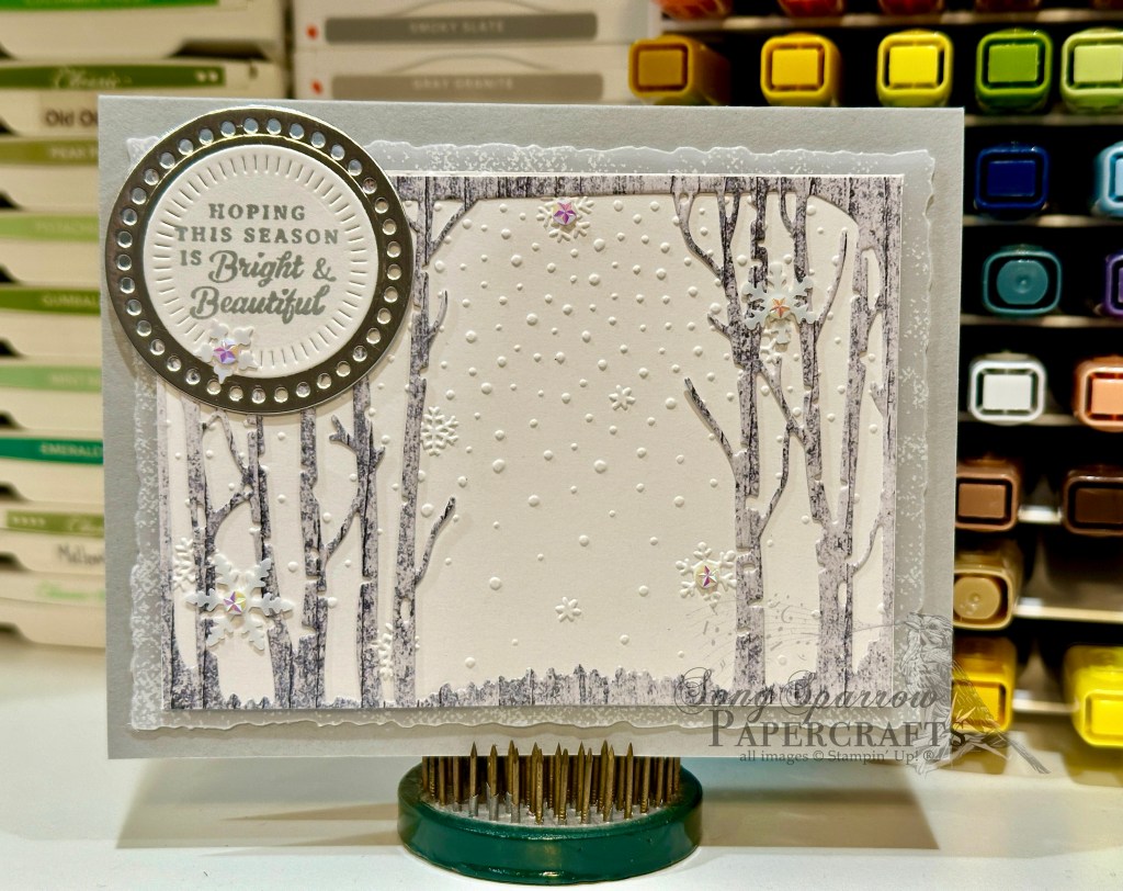 We get started with a card base of Smoky Slate cardstock. A piece of Graceful Greenery vellum serves as a soft base for our focal panel and is diecut using the Deckled Rectangles dies. Our focal panel combines a white background embossed with the Snowflake Sky embossing folder and the trees diecut from the grey woodgrain in the Country Woods patterned paper pack using the In the Grove die. The sentiment from the Peaceful Season stamp set is stamped in Smoky Slate on white cardstock and then diecut using the Radiating Stitches circle die and then matted with a silver foil circle diecut with the Everyday Details dies. A scattering of snowflakes and iridescent faceted gems give the snowy background the perfect amount of twinkle.